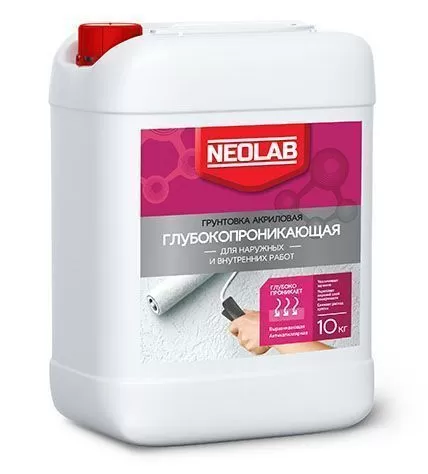 Грунтовка глубокого проникновения Neolab используется для грунтования поверхностей внутри помещений, а также при фасадных работах. Улучшает сцепляемость основания с лакокрасочными материалами, строительными смесями и клеевыми растворами. После высыхания уменьшает влагопоглощение и не нарушает воздухообмен обработанного основания, делает его структуру более однородной.